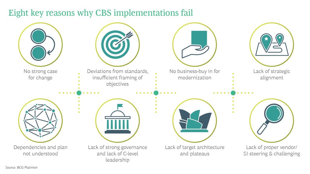 CBS replacement projects are rather infrequent occurrences; thus, there is little to no relevant experience within any given organization. Between 25 and 30 percent of these ventures fail in one or more areas. Eight key reasons for failure of a CBS implementation have been identified: